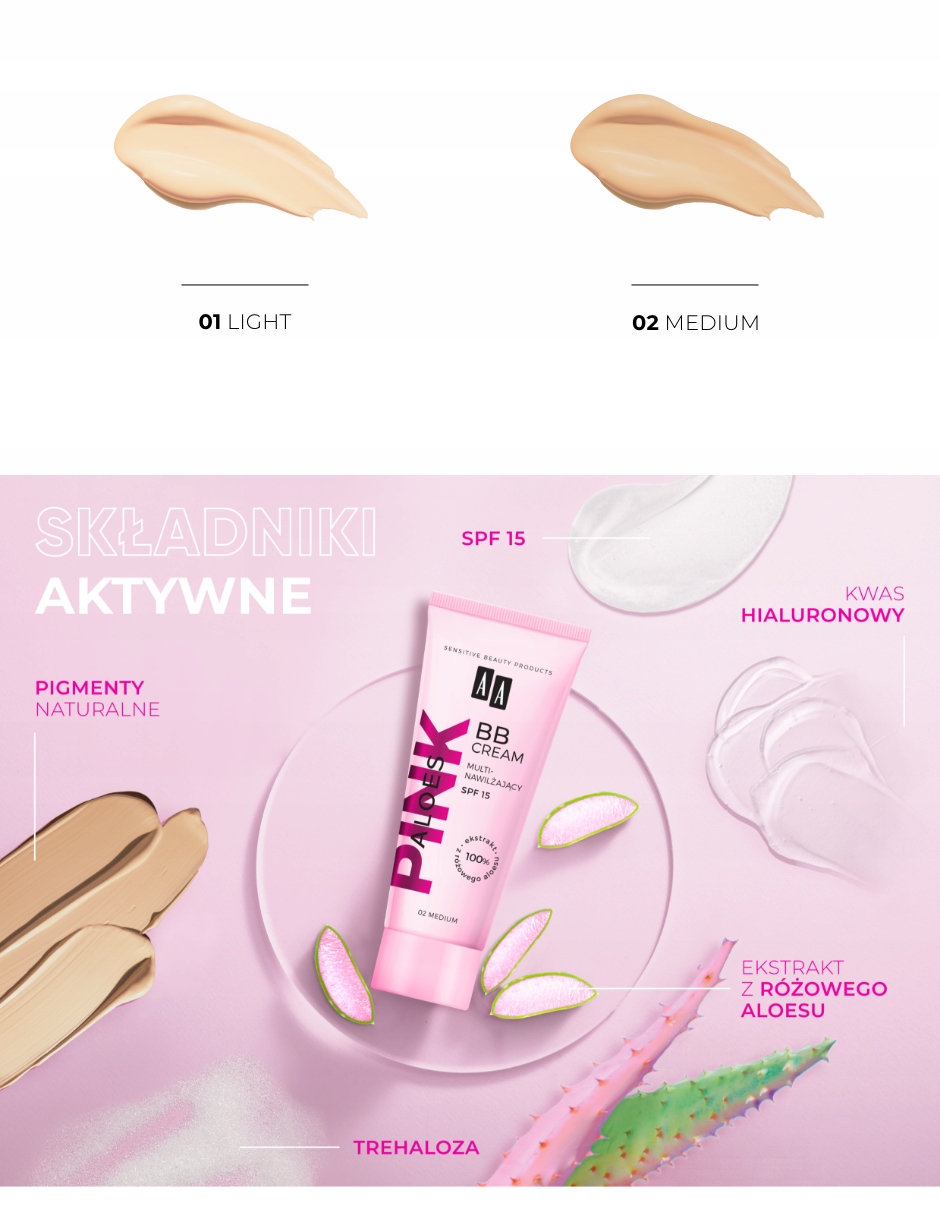 Pink Aloes to seria kosmetyków marki AA, opracowana z myślą o skórze potrzebującej nawodnienia i ukojenia. To idealna propozycja dla cery wrażliwej, zmęczonej i pozbawionej blasku. Wszystkie produkty z tej linii zawierają ekstrakt z różowego aloesu, który znany jest ze swoich intensywnie nawilżających i regenerujących właściwości. Dzięki temu pielęgnacja staje się nie tylko skuteczna, ale też przyjemna. Regularne stosowanie kosmetyków z serii Pink Aloes widocznie poprawia kondycję skóry, przywracając jej zdrowy wygląd i miękkość. Krem BB z tej linii to jeden z tych produktów, które doskonale wpisują się w codzienną rutynę – zarówno pielęgnacyjną, jak i makijażową.