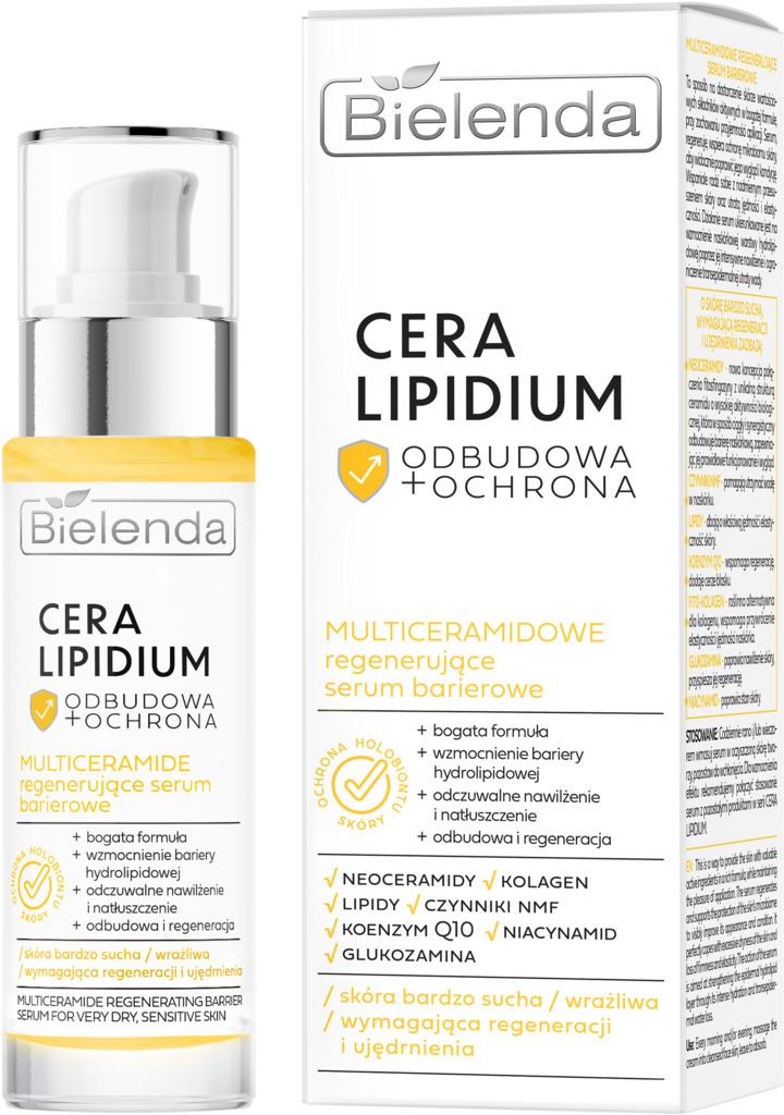Silnie odwodniona i wrażliwa cera wymaga czegoś więcej niż tylko lekkiego nawilżenia. Bielenda Cera Lipidium Multiceramidowe Regenerujące Serum Barierowe zapewnia głębokie odżywienie, odbudowę i natychmiastowe ukojenie, odpowiadając na potrzeby nawet najbardziej wymagającej skóry. Multiceramidowe regenerujące serum barierowe ma bogatą, otulającą konsystencję, która działa jak regenerujący kompres. Dzięki zawartości neoceramidów, lipidów oraz czynnika NMF, kosmetyk uzupełnia niedobory składników ochronnych i zabezpiecza naskórek przed dalszym przesuszeniem. Co więcej, przywraca komfort już po pierwszym użyciu, zmniejszając uczucie ściągnięcia i szorstkości. Formuła bez zapachów i barwników czyni ten produkt idealnym również dla skóry skłonnej do podrażnień.