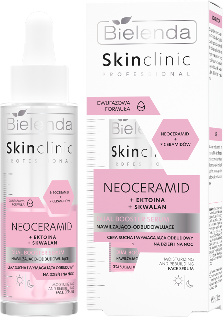 Bielenda Professional Skin Clinic Neoceramid Dual Booster Serum Nawilżająco-Odbudowujące to zaawansowana pielęgnacja dla skóry suchej i wymagającej regeneracji. Dwufazowa formuła łączy skuteczność składników aktywnych z komfortem codziennego stosowania. Nawilżająco-odbudowujące serum-booster do twarzy Bielenda Skin Clinic zawiera ektoinę, skwalan oraz połączenie 7 ceramidów z neoceramidem, które wspólnie odbudowują, nawilżają i chronią skórę. Dzięki temu cera już po pierwszym użyciu staje się bardziej miękka i elastyczna. Co więcej, lekka konsystencja szybko się wchłania i nie obciąża, co czyni serum idealnym również pod makijaż. Jednocześnie składniki aktywne wspierają barierę hydrolipidową i zabezpieczają skórę przed przesuszeniem.