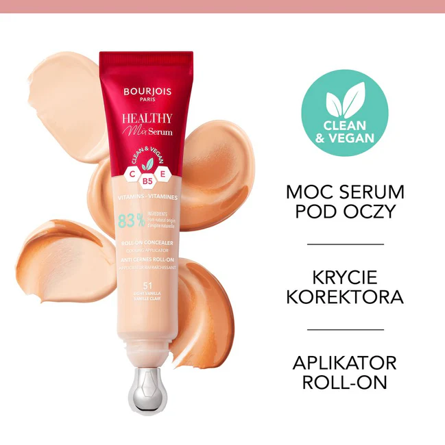 Delikatna skóra pod oczami wymaga szczególnej troski, zwłaszcza gdy zmęczenie daje o sobie znać. Rozwiązaniem może być Bourjois Healthy Mix Clean Serum Kryjący Korektor pod Oczy Roll-On, który łączy skuteczność korektora z intensywnie pielęgnującym działaniem serum. Formuła została wzbogacona witaminami C, E i B5, dzięki czemu nie tylko niweluje cienie i oznaki zmęczenia, ale również nawilża, rozjaśnia i odżywia skórę wokół oczu. Ten innowacyjny kosmetyk 2 w 1 z aplikatorem typu roll-on to wygoda, przyjemność stosowania i efekt świeżości – o każdej porze dnia.
