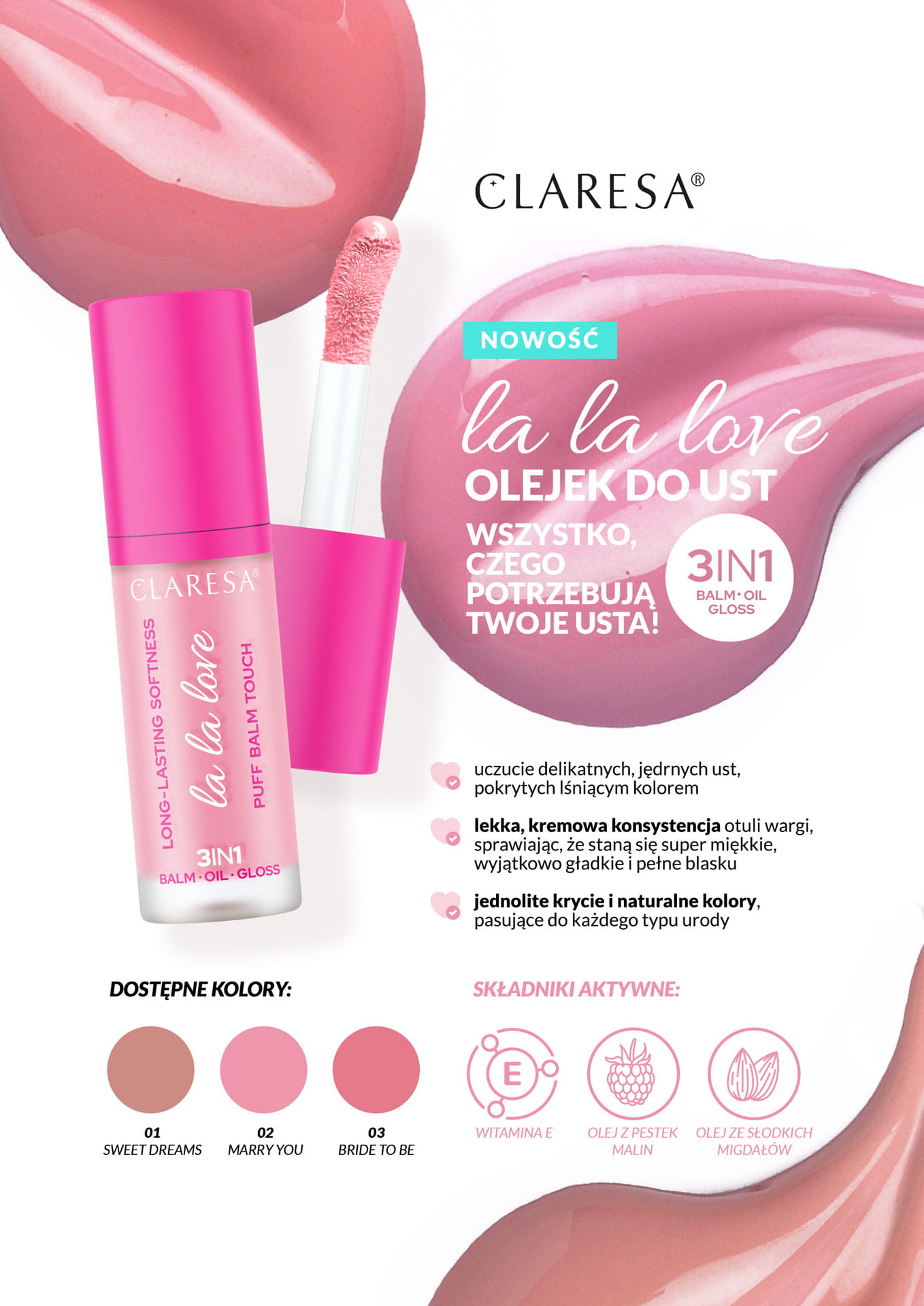 - Formuła 3w1 – łączy błyszczyk, olejek i balsam