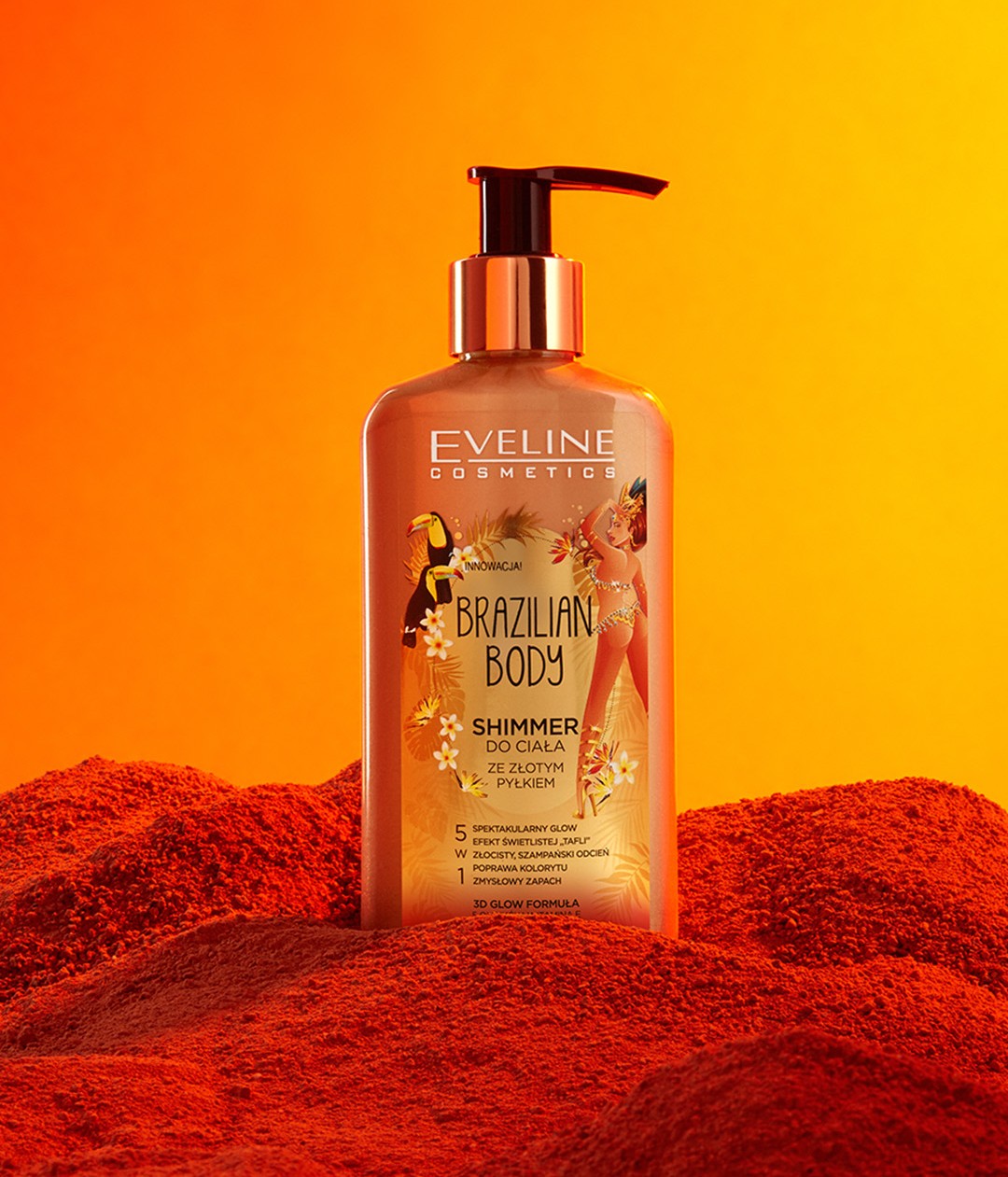 Shimmer do ciała ze złotym pyłkiem pozwala się cieszyć piękną, idealnie rozświetloną, wygładzoną i nawilżoną skórą, Wyjątkowa, wzbogacona tysiącami złotych, mieniących się w słońcu drobinek formuła, doskonale wtapia się w skórę, nadając jej blask, poprawiając koloryt oraz perfekcyjnie maskując wszelkie niedoskonałości. Doskonały do zastosowania przed ważnym wyjściem, imprezą lub na co dzień by podkreślić opaleniznę.