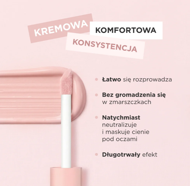 Konsystencja ma ogromne znaczenie, szczególnie w tak delikatnej strefie jak okolice oczu. Ten lekki korektor pod oczy wyróżnia się kremową, ale jednocześnie niewyczuwalną formułą, która łatwo się rozprowadza i nie zbiera w załamaniach skóry. Dzięki temu makijaż wygląda świeżo i naturalnie przez wiele godzin. Produkt dobrze współpracuje zarówno z pielęgnacją, jak i podkładem, co sprawia, że możesz bez problemu włączyć go do swojej codziennej rutyny.