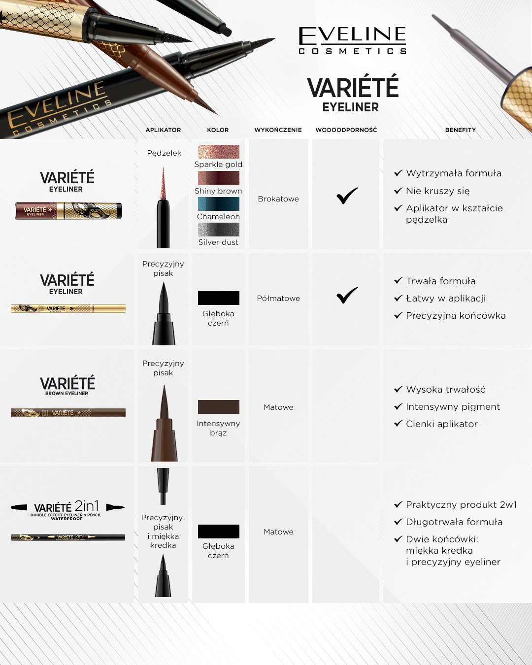 Chcesz uzyskać jeszcze lepszy efekt? Połącz eyeliner ztuszem do rzęs Eveline Variete Brown! Brązowy tusz doskonale komponuje się z eyelinerem, tworząc harmonijny i naturalny makijaż. Taki duet podkreśli spojrzenie w subtelny, ale wyrazisty sposób, idealnie pasując do jasnych włosów i delikatniejszych rysów twarzy. Dzięki temu zestawowi Twój makijaż będzie perfekcyjny od rana do wieczora!
