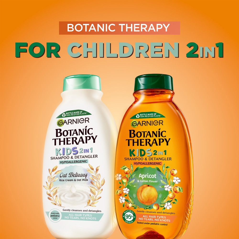 Szampon dla dzieci Garnier Botanic Therapy Kids łączy w sobie oczyszczającą moc szamponu z właściwościami odżywki, co sprawia, że włosy stają się miękkie i gładkie. Dzięki tej formule, włosy dziecka są łatwiejsze do rozczesania, a kołtuny i splątane pasma stają się przeszłością. Po użyciu szamponu 2w1 Garnier, pasma są pełne blasku, wyglądają zdrowo i miękko, a do tego mają przyjemny zapach. Produkt jest szczególnie polecany do stosowania codziennie, ponieważ formuła szamponu została opracowana z myślą o skórze wrażliwej dziecka. Dzięki zastosowaniu naturalnych, łagodnych składników, szampon dla dzieci Garnier Botanic Therapy Kids nie tylko dba o czystość, ale także wspiera naturalny proces ochrony skóry głowy, nie wysuszając jej. To doskonałe rozwiązanie do codziennego użytku, które jednocześnie sprawia, że mycie włosów staje się zabawą!