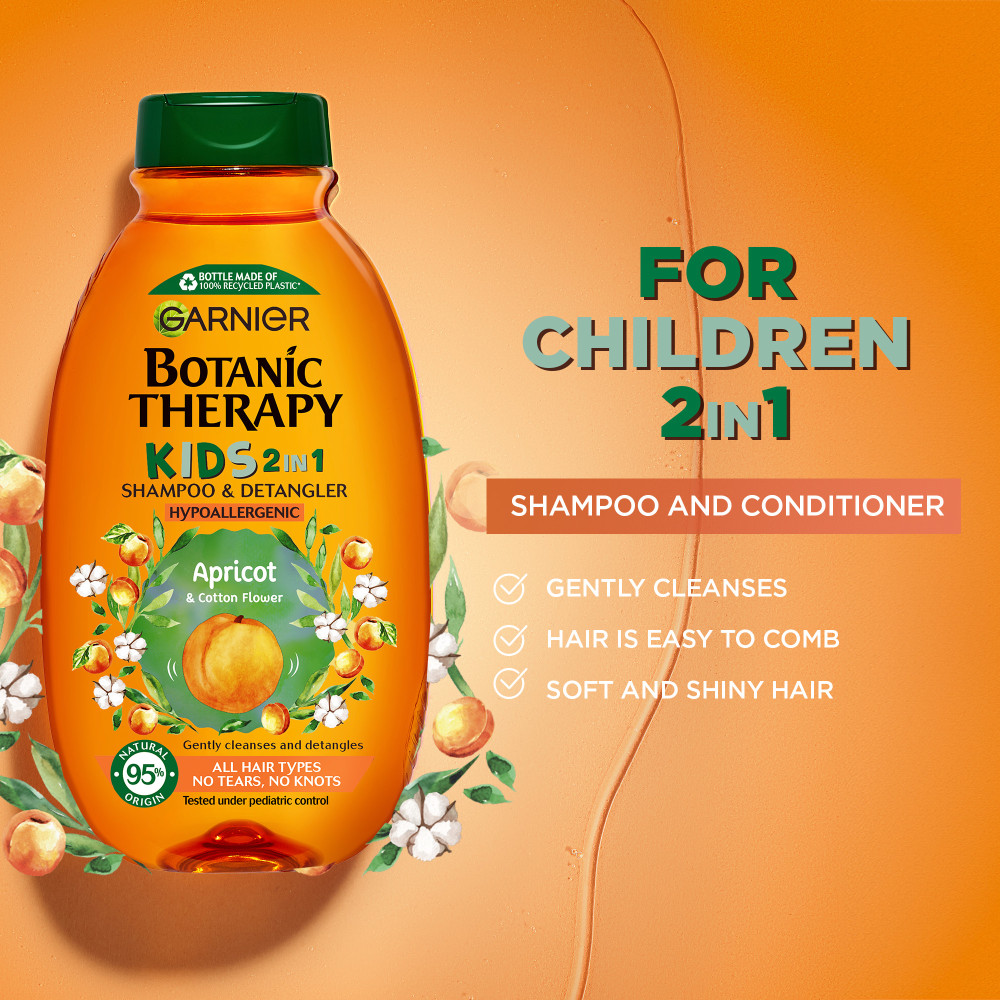 Garnier Botanic Therapy Kids Szampon z Odżywką 2w1 Morela i Kwiat Bawełny to idealne rozwiązanie w codziennej pielęgnacji włosów dzieci. Dzięki swojej delikatnej formule, delikatny szampon z odżywką do włosów dla dzieci Garnier Botanic Therapy Kids skutecznie oczyszcza skórę głowy i włosy malucha, nie podrażniając ich. Formuła szamponu jest łagodna, a jednocześnie skuteczna w usuwaniu zabrudzeń. Produkt działa wyjątkowo delikatnie, nie powodując szczypania w oczach, co sprawia, że mycie włosów staje się przyjemnością. Zawiera naturalne składniki, takie jak ekstrakt z moreli i kwiat bawełny, które dbają o zdrowie włosów i skóry głowy dziecka. Szampon 2w1 od Garnier to połączenie skutecznego oczyszczania z pielęgnacją, co ułatwia codzienne mycie i rozczesywanie.
