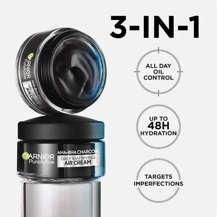 Krem żel Garnier PureActive AHA+BHA Charcoal do pielęgnacji skóry przetłuszczającej się, problematycznej i z widocznymi niedoskonałościami dba nie tylko o wygląd, ale i o komfort skóry. Ten matujący krem na dzień i na noc zapobiega pojawianiu się nowych wyprysków i wspiera odbudowę naskórka. Co więcej, kwasy złuszczają martwe komórki, co poprawia strukturę skóry i ułatwia wchłanianie innych kosmetyków. Dodatkowo produkt poprawia koloryt cery i wyrównuje jej powierzchnię. Jego lekka konsystencja nie obciąża skóry i nie zapycha porów. Dzięki temu krem może być używany regularnie, nawet przez osoby z wrażliwą cerą. Skóra odzyskuje równowagę, wygląda zdrowiej i dłużej zachowuje świeżość.