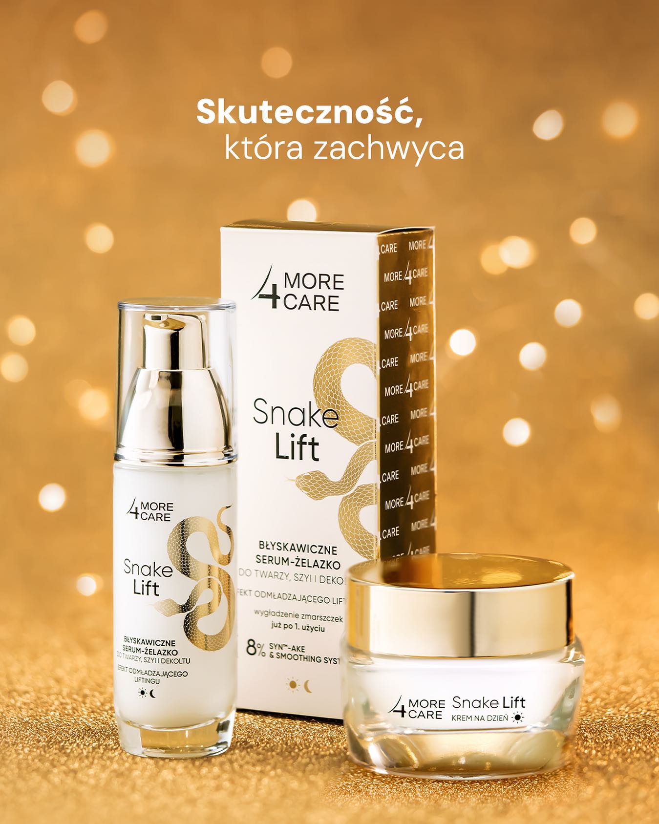 More4Care Snake Lift Intensywnie Wygładzający Krem-Żelazko do Twarzy na Dzień to nowoczesny kosmetyk, który pomaga skutecznie redukować oznaki starzenia. Dzięki zastosowaniu innowacyjnej technologii Syn-Ake & Smoothing System wygładza zmarszczki, poprawia napięcie skóry i modeluje kontur twarzy. Formuła naśladująca działanie toksyny z jadu żmii zapobiega wiotczeniu skóry, wspiera jej regenerację oraz redukuje mimiczne linie. Dodatkowo nawilża cerę i przywraca jej elastyczność, sprawiając, że staje się bardziej sprężysta i wygładzona. Dzięki lekkiej konsystencji intensywnie wygładzający krem-żelazko z serii Snake Lift od More4Care szybko się wchłania i nie pozostawia tłustego filmu. Kosmetyk sprawdzi się jako baza pod makijaż, utrzymując skórę w dobrej kondycji przez cały dzień. Wegańska formuła oparta na składnikach aktywnych intensywnie wspomaga walkę z oznakami starzenia i nadaje cerze zdrowy, promienny wygląd.