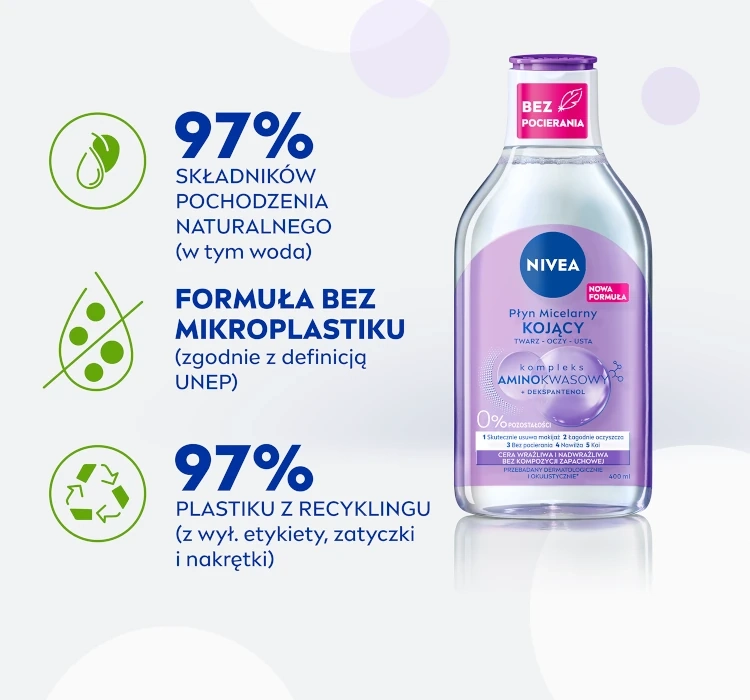 Płyn micelarny Nivea zawiera kompleks aminokwasowy, dekspantenol i oczyszczające micele, które wspólnie działają, aby nie tylko oczyścić skórę, ale także ją nawilżyć i odżywić. Formuła minimalizuje konieczność pocierania, co czyni go idealnym dla skóry wrażliwej. Stosując go regularnie, przygotujesz cerę na kolejne etapy pielęgnacji i zauważysz poprawę jej kondycji.