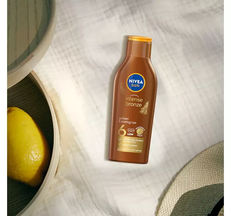 Karotenowy balsam do opalania SPF6 NIVEA SUN ma również formułę przyjazną środowisku. Została stworzona z troską o rafy koralowe, ponieważ nie zawiera szkodliwych filtrów UV ani mikroplastiku. Co ważne, karotenowy balsam do opalania NIVEA SUN Intense Bronze ma wodoodporną konsystencję, dlatego świetnie sprawdza się zarówno na plaży, jak i podczas aktywności fizycznej. Regularne stosowanie pomaga uzyskać głęboką opaleniznę, jednocześnie zapewniając skórze pielęgnację oraz promienny wygląd. Ten balsam to idealny wybór na wakacje, ale również na co dzień – zawsze wtedy, gdy chcesz cieszyć się piękną opalenizną i komfortem.