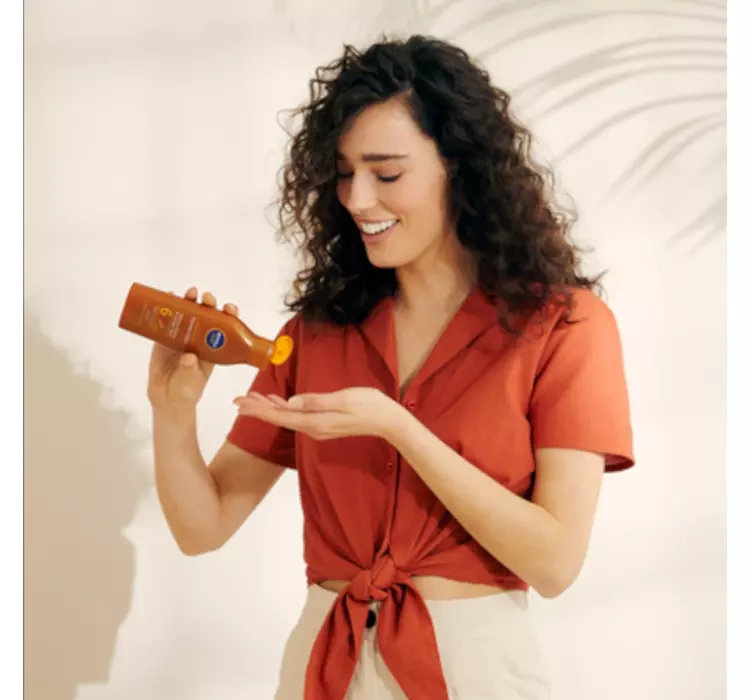 NIVEA SUN Karotenowy Balsam do Opalania SPF6 to idealny wybór dla osób, które marzą o naturalnej, złocistej opaleniźnie. Kosmetyk zapewnia niską ochronę przeciwsłoneczną, dzięki czemu świetnie sprawdzi się u osób z ciemniejszą karnacją lub przy już opalonej skórze. NIVEA SUN Karotenowy balsam do opalania wzbogacony ekstraktem karotenowym przyspiesza proces opalania i wspiera utrzymanie jednolitego koloru. Jednocześnie zawarta w składzie witamina E chroni skórę przed stresem oksydacyjnym, a olejek jojoba dogłębnie ją nawilża i wygładza. Dzięki lekkiej formule balsam łatwo się rozprowadza, nie pozostawiając tłustego filmu. Zapewnia pełen komfort nawet podczas długotrwałego przebywania na słońcu.