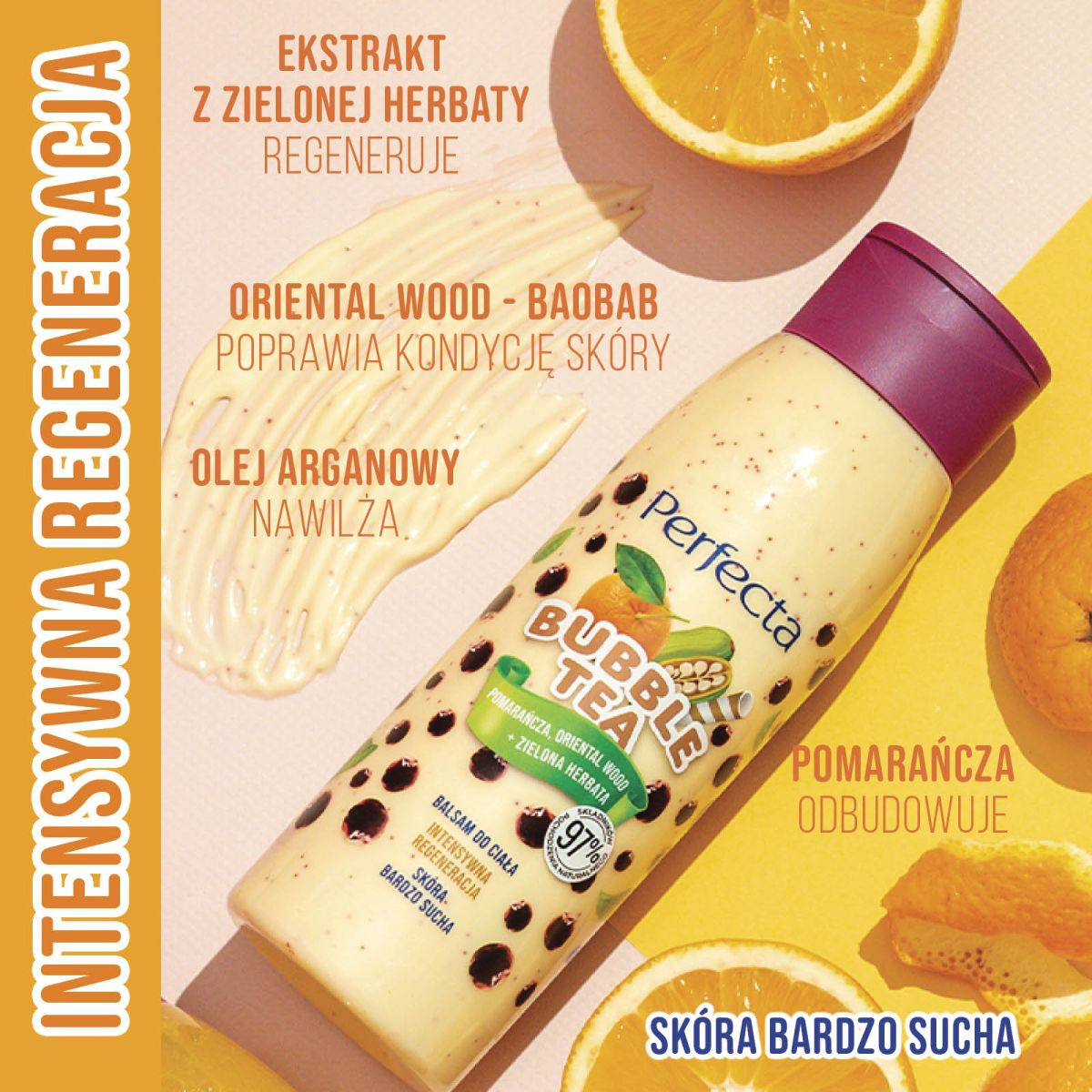 Perfecta Bubble Tea Pomarańcza, Oriental Wood + Zielona Herbata Regenerujący Balsam do Ciała – Naturalna pielęgnacja i regeneracja