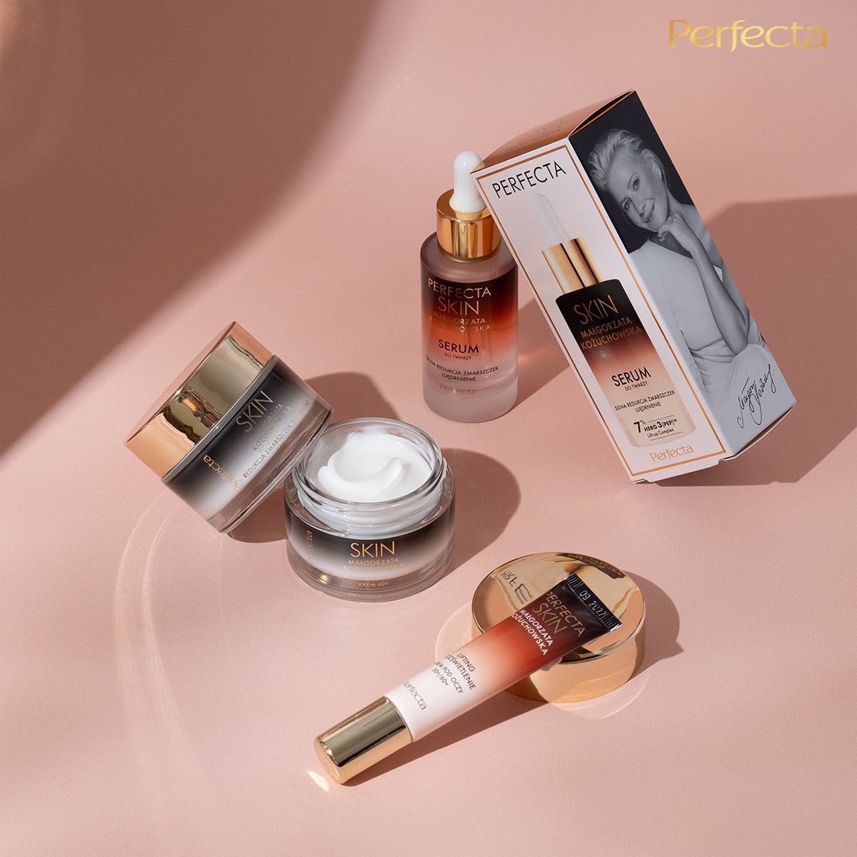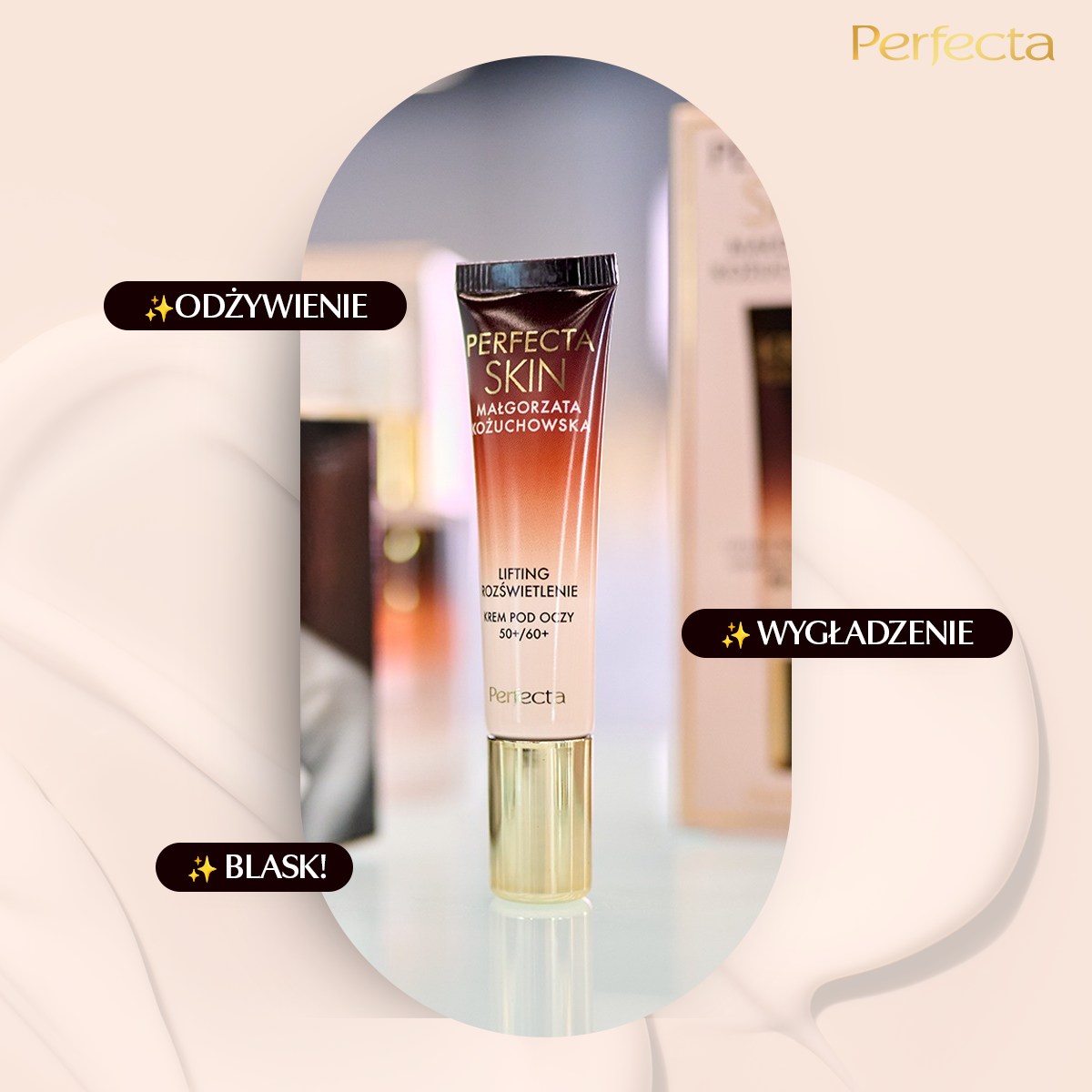 Delikatna skóra dojrzała wymaga kosmetyku, który łączy skuteczne działanie z przyjemnością stosowania. Perfecta Skin Małgorzata Kożuchowska Liftingująco-Rozświetlający Krem pod Oczy 50+/60+ powstał właśnie z myślą o cerze z widocznymi zmarszczkami, utratą jędrności i oznakami zmęczenia. Krem pod oczy z serii Perfecta Małgorzata Kożuchowska nawilża, regeneruje i jednocześnie rozświetla spojrzenie, poprawiając jego wyrazistość i świeżość. Co ważne, formuła została wzbogacona o witaminę C, która działa antyoksydacyjnie i przywraca skórze naturalny blask. Dzięki temu spojrzenie zyskuje młodzieńczy wygląd, a oznaki zmęczenia stają się mniej widoczne z każdym dniem.
